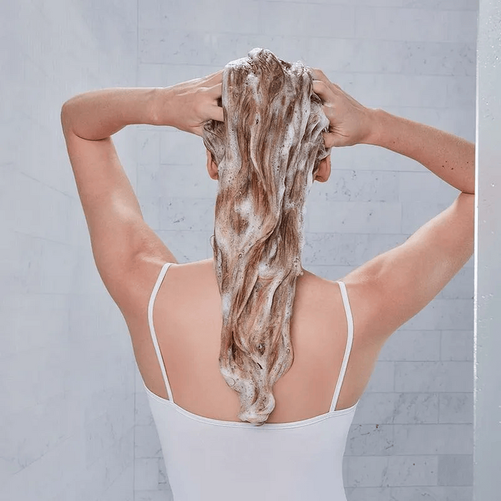 - ضعـي الشـامبو على جـذور الشـعر المبلـل ودلـكي بلطف. يشـطف جيـدا.