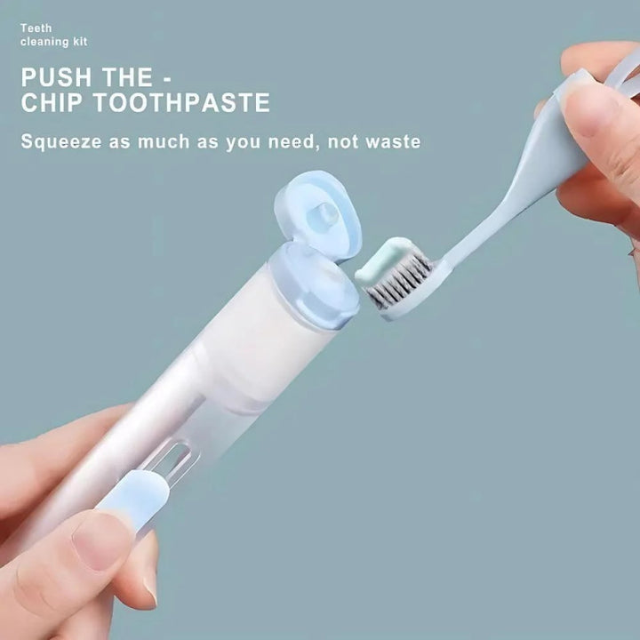 فرشاة أسنان عملية مصممة للسفر والتنقل، تأتي مع موزع معجون مدمج لتوفير راحة وسهولة الاستخدام أثناء التنقل.