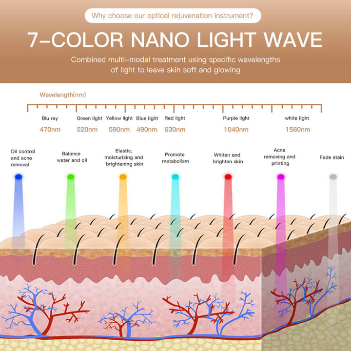 ابدئي رحلة العناية ببشرتك باستخدام جهاز العناية بتقنية الضوء السباعي، الذي يجمع بين أحدث التقنيات لتحسين مظهر البشرة واستعادة نضارتها. كل لون من ألوان الضوء السبعة يقدم فائدة متخصصة للبشرة: