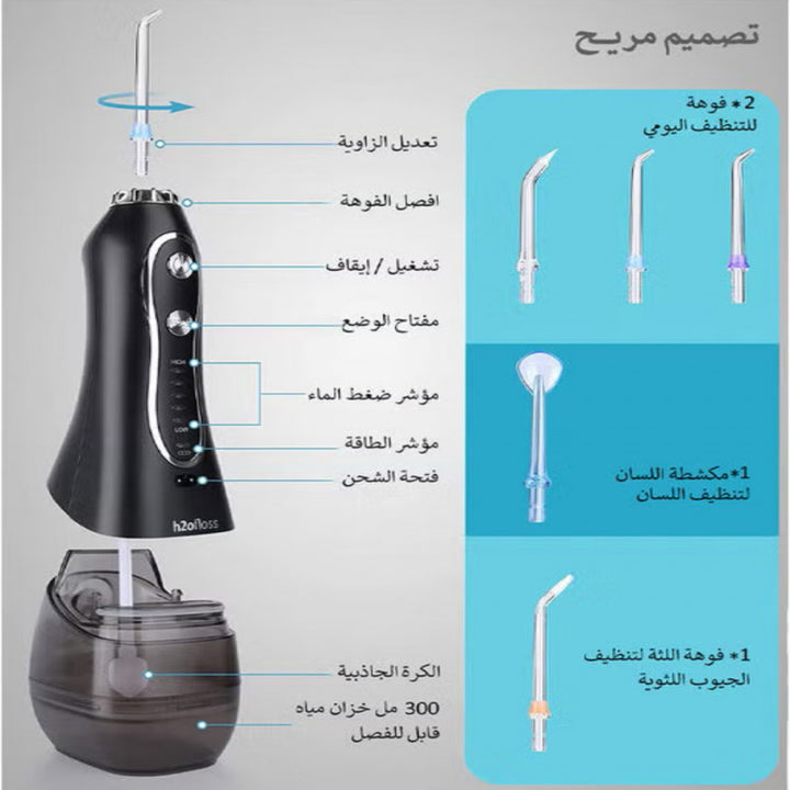 جهاز تنظيف الأسنان بالماء هذا يتميز بتصميم صغير الحجم ومحمول وخفيف الوزن، ما يجعله سهل الحمل أثناء السفر.