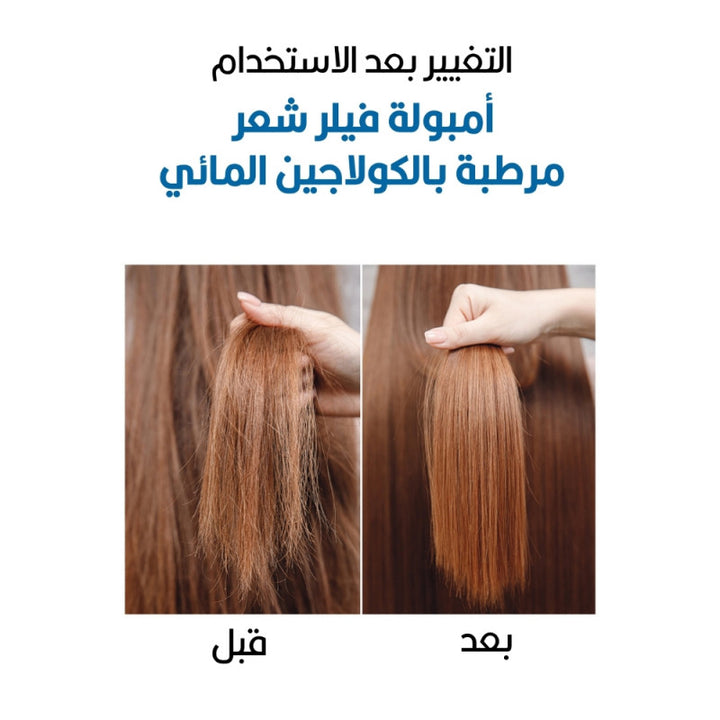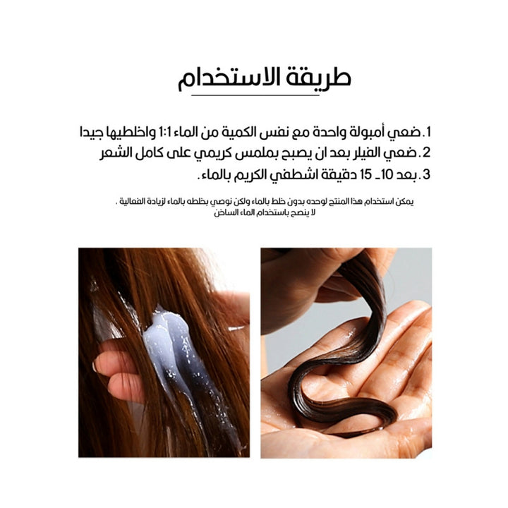 أمبولة فيلر معالج ومغذي للشعر يتكون من الكيراتين والحرير والإيلاستين والكولاجين المتحلل يساعد في الحصول على شعر صحي وناعم وحريري، مناسب لجميع أنواع الشعر.