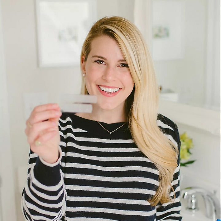 الاستخدام: باستخدام مرآة، ضع جانب الجل من الشريط على الأسنان الأمامية، قم بمحاذاة الحافة المستقيمة للشريط مع الأسنان المطوية على خط اللثة واضغط لتأمينها،