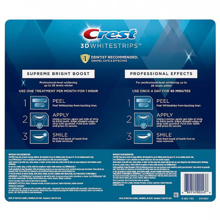ما عليك سوى وضع Crest 3Dwhitestrips professional effects لمدة 45 دقيقة يوميًا أو supreme bright boost لمدة 60 دقيقة يوميًا. تتضمن هذه العبوة 54 شريحة لتبييض الأسنان، 27 للأسنان العلوية و27 للأسنان السفلية.