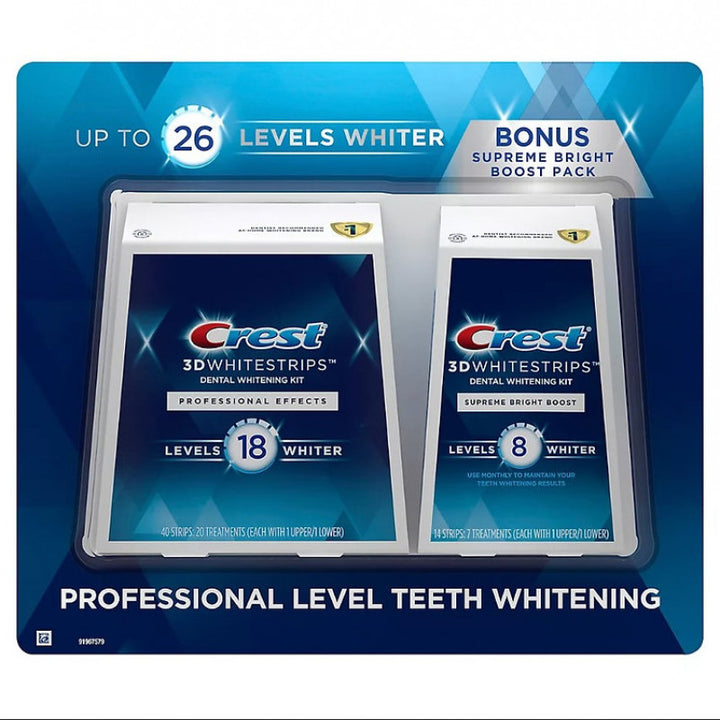 تتضمن شرائط 3Dwhitestrips الاحترافية 20 علاجًا + مجموعة تبييض الأسنان المنزلية المكونة من سبعة علاجات من Supreme Bright Boost