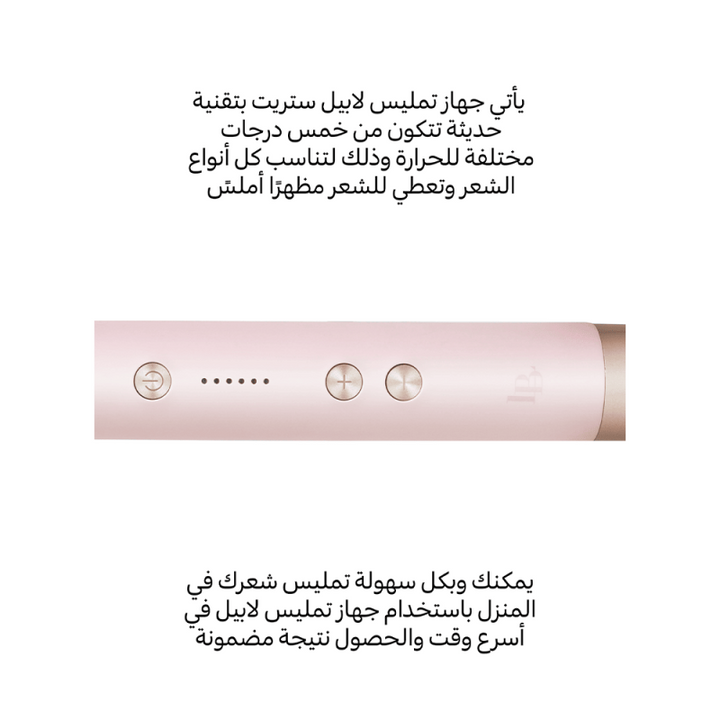 مزايا لابيل ستريت الوردي: 1/ درجة الحرارة تصل حتى 200 درجة مئوية. 2/ سلك دوار مع خاصية الدوران حتى 360 درجة. 3/ خاصية إيقاف التشغيل التلقائي. 4/ تصميم مقبض عملي. 5/ تصميم فريد بحواف سيراميكية معززة بتقنية الأيونات السالبة ومانعة للحرارة في وقت واحد.