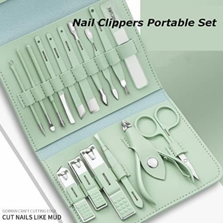 مجموعة العناية بالاظافر - مكونة من 16 قطعة مختلفة الوظائف مصنوعة من الستانلس ستيل مع حقيبة جلد فاخرة مناسبة للسفر، تناسب الرجال والنساء